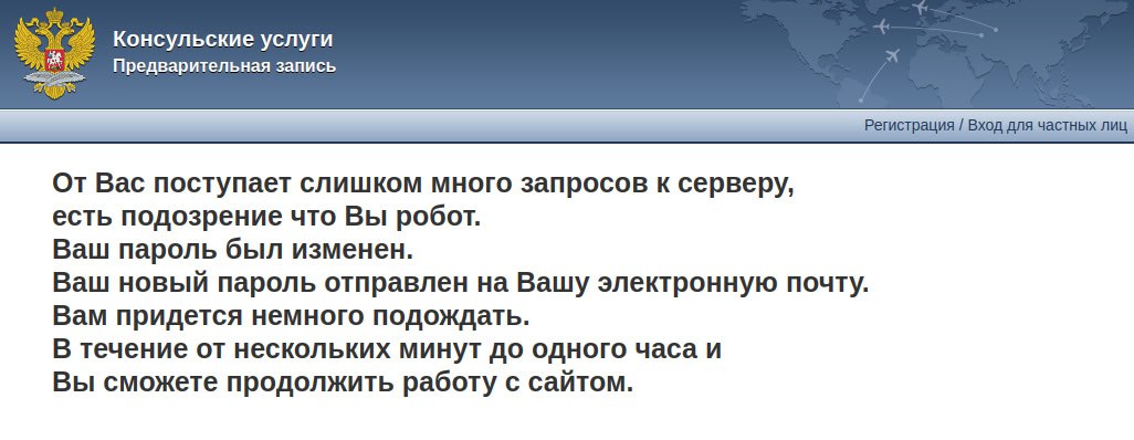 блин... не чаще, чем раз в какое время можно заходить на сайт МИД РФ? вчера попробовал записаться на выдачу загранпаспорта, пару раз проверил лист ожидания, а сегодня получаю вот такое сообщение. новый пароль пришел, но с ним то же самое, прошло уже больше часа