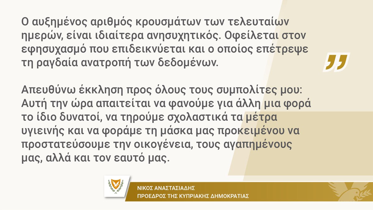 "Некоторые меры были приняты в Никосии и Лимассоле, а также в отношении использования маски в помещениях, и мы ожидаем увидеть их результаты. Кроме того, завтра состоится встреча с Президентом республики, и в случае необходимости будут приняты другие меры"