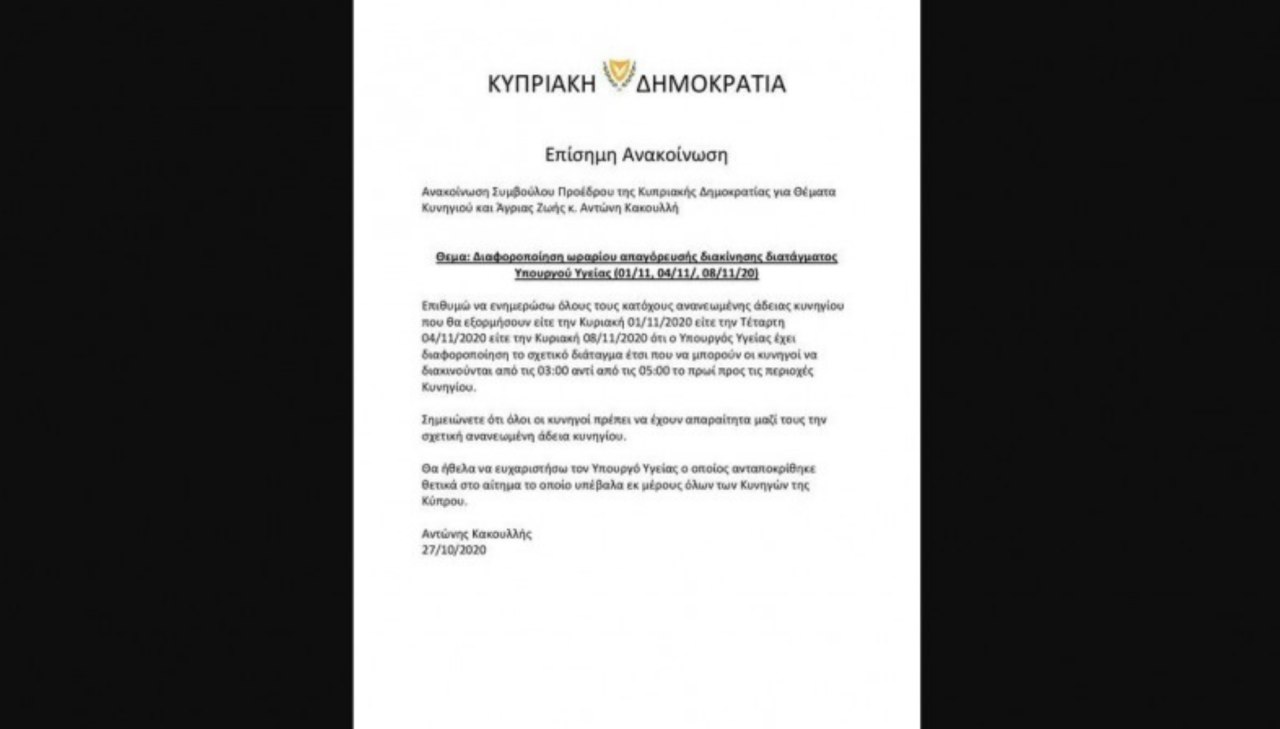 Министр здравоохранения внес исправления в указ, который предусматривает запрет движения транспорта в провинциях Лимассол и Пафос, чтобы охотники могли выходить с 03:00 утра, а не с 05:00.