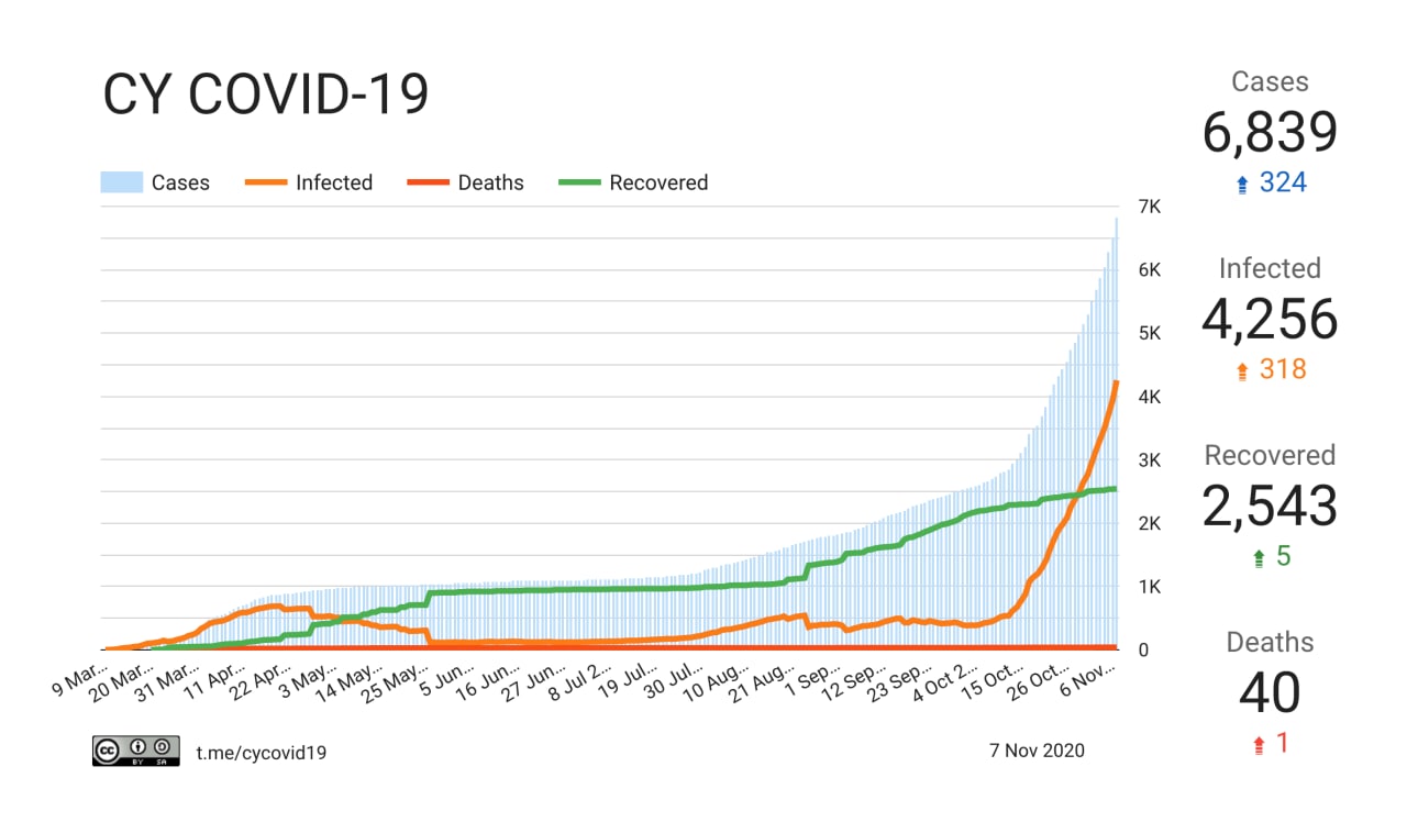 Всего за одну неделю в ноябре было зарегистрировано 25% всех случаев с начала пандемии на Кипре, то есть 1505 случаев, при этом самым тревожным элементом является резкое увеличение количества госпитализаций, которое сейчас достигает 70.