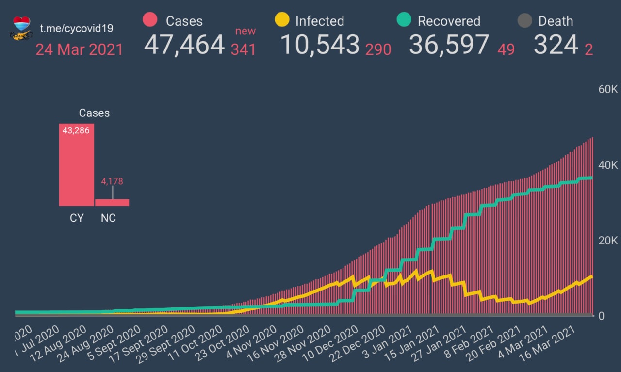 За 14 дней (10.03-23.03) Лимассол всё еще "лидирует", но другие провинции Кипра активно растут по количеству кейсов.