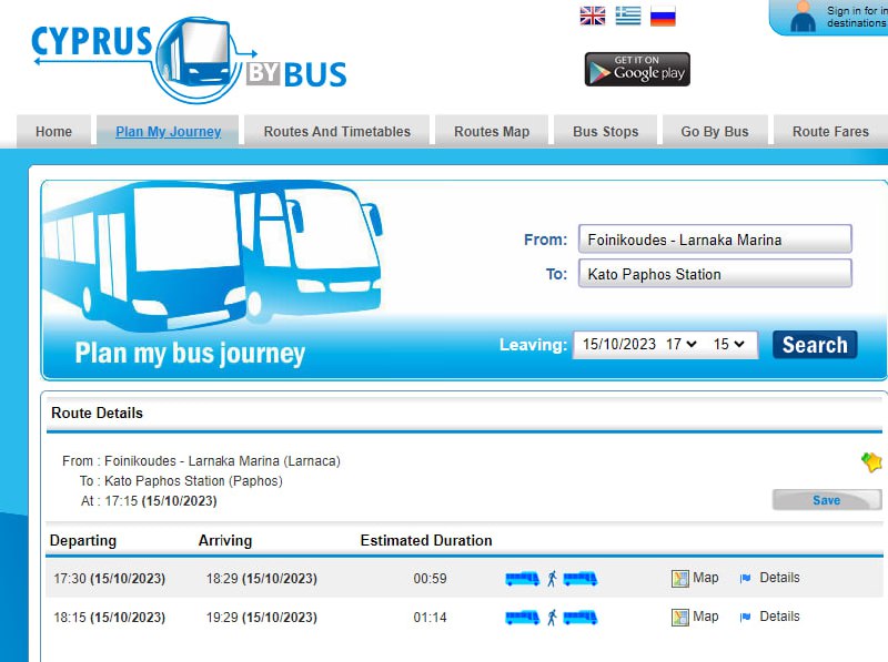 Прямой из Ларнаки до Пафоса редко ходит, а с пересадкой в Лимасоле гораздо больше автобусов. У них багажный отсек есть для чемоданов, к слову я видал туда и велики суют.