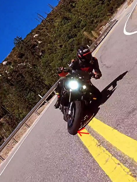 это уже зад поехал, но колисо не на разметке и разметка она не толстая белая. и колесо во внутрь поворачиватеься значит он рулит в повороте то есть поднимает байк