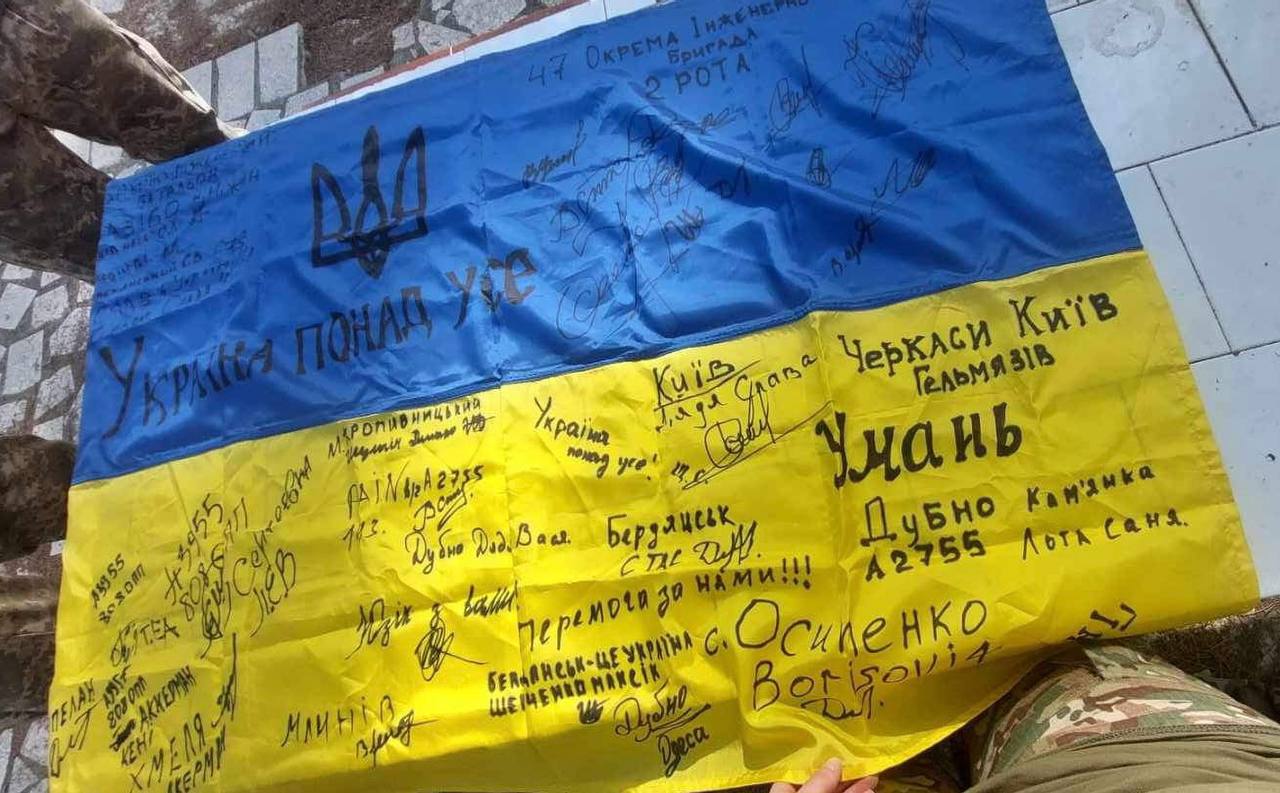 🇺🇦 великий прапор України із автографами українських саперів, які проходили навчання на Кіпрі, зараз вони вже на передовій, на жаль, серед них є ті, кого ми втратили…