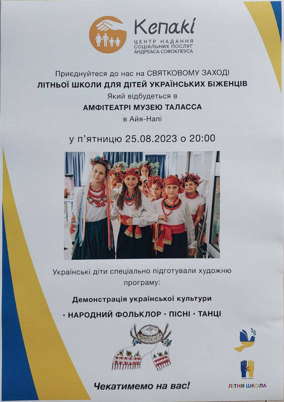 Центр надання соціальних послуг Андреаса Софуклеуса, Фонд «Кепаки», запрошує приєднатись до святкового концерту присвяченому Дню Незалежності України від літньої школи для дітей українських біженців в Айя-Напі.
