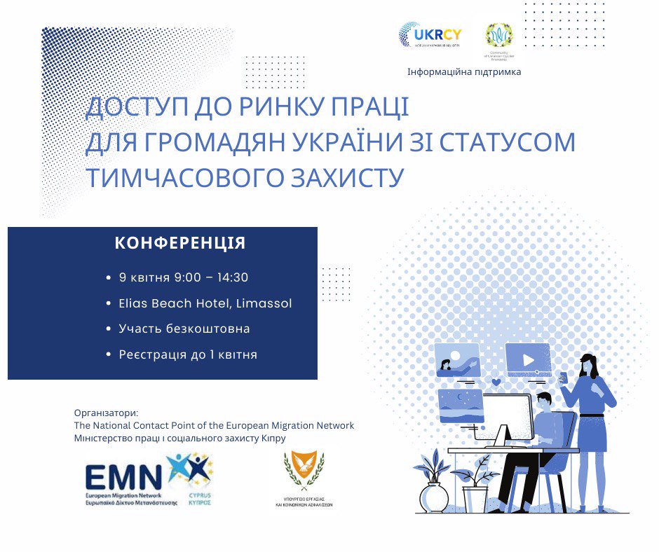 Дорогі українці, запрошуємо вас на конференцію «Доступ до ринку праці для громадян України зі статусом тимчасового захисту», організовану Національним контактним центром мережі європейської міграції (The National Contact Point of the European Migration Network) і Міністерством праці і соціального захисту Кіпру за підтримки Товариства Українсько-Кіпрської Дружби.