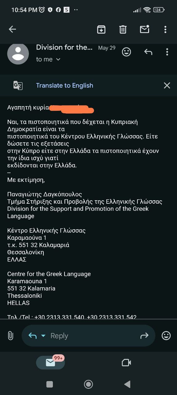 Вот я нашла текст ...."που μπορεί να αποκτηθεί μετά από τις Εξετάσεις Πιστοποίησης Ελληνομάθειας που διεξάγονται από το Κέντρο Ελληνικής Γλώσσας της Ελληνικής Δημοκρατίας μέσω της Υπηρεσία Εξετάσεων της Διεύθυνσης Ανώτερης Εκπαίδευσης του Υπουργείου Παιδείας, Αθλητισμού και Νεολαίας." И как это понимать никому не известно. Потом ещё добавили приписку про экзамен Кипрского университета ,который ждемС.