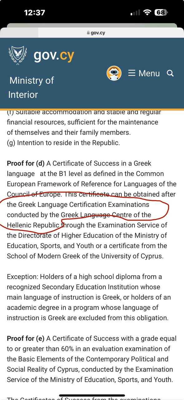 Да, я поняла. Но с другой стороны оговорки о том, что экзамен должен быть сдан на территории Кипра тоже нет. По идее должны принимать сертификат аккредитованного центра. Самое надежное, конечно, уточнить в демархии