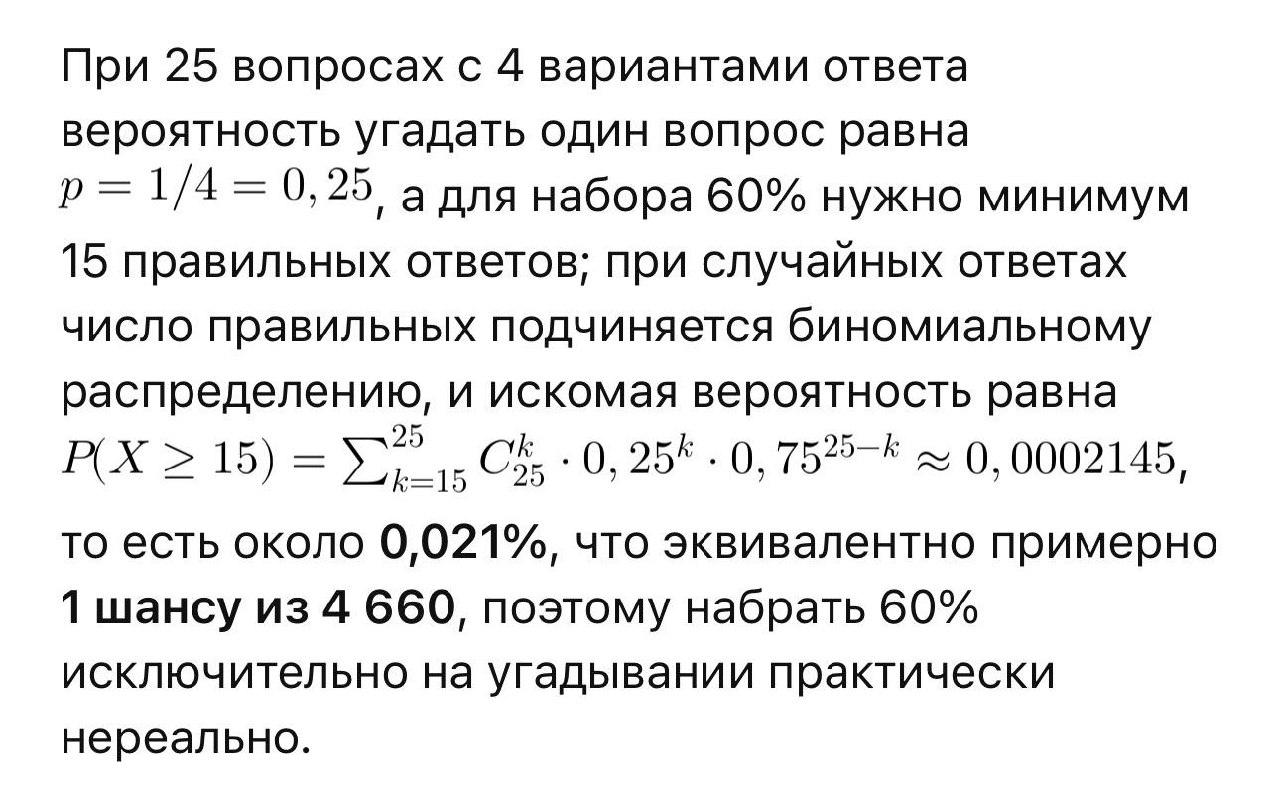 Чисто статистически, если прийти на экзамен совершенно не готовясь и имея в голове кое-какие отрывочные сведения примерно по трети вопросов (а они есть у всех, практически), то вероятность сдать экзамен проставляя галочки случайным образом будет около 10%. Вот видимо вы в эти 10% и попали.