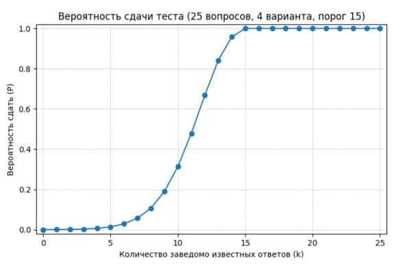 Ниже - график вероятности сдачи экзамена при простановке галочек случайным образом в зависимости от количества заведомо известных ответов. На семь-девять вопросов ответы, как правило, заведомо известны всем безо всякой подготовки (типа "можно ли въезжать через Северный Кипр", "Купюр какого номинала евро не существует" и пр.)