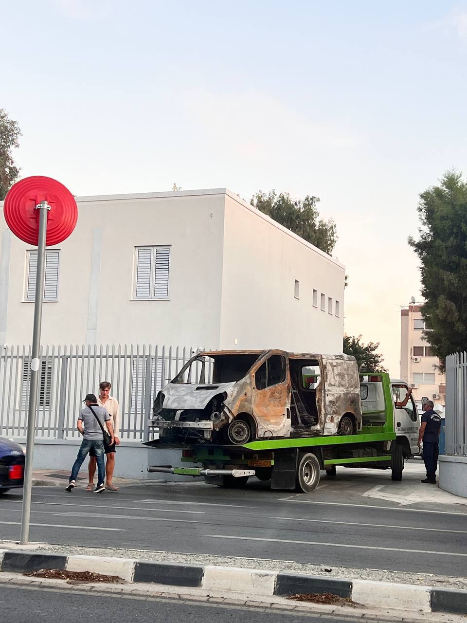 Сгоревший фургон преступников привезли в полицейский участок в Гермасойю.