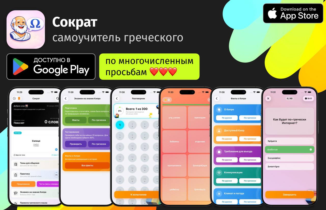 Учи греческий вместе с Сократом для iOS: сотни уровней, десятки тем, тесты, огромный словарь, экзамен на знание культуры и истории Кипра + виджеты.