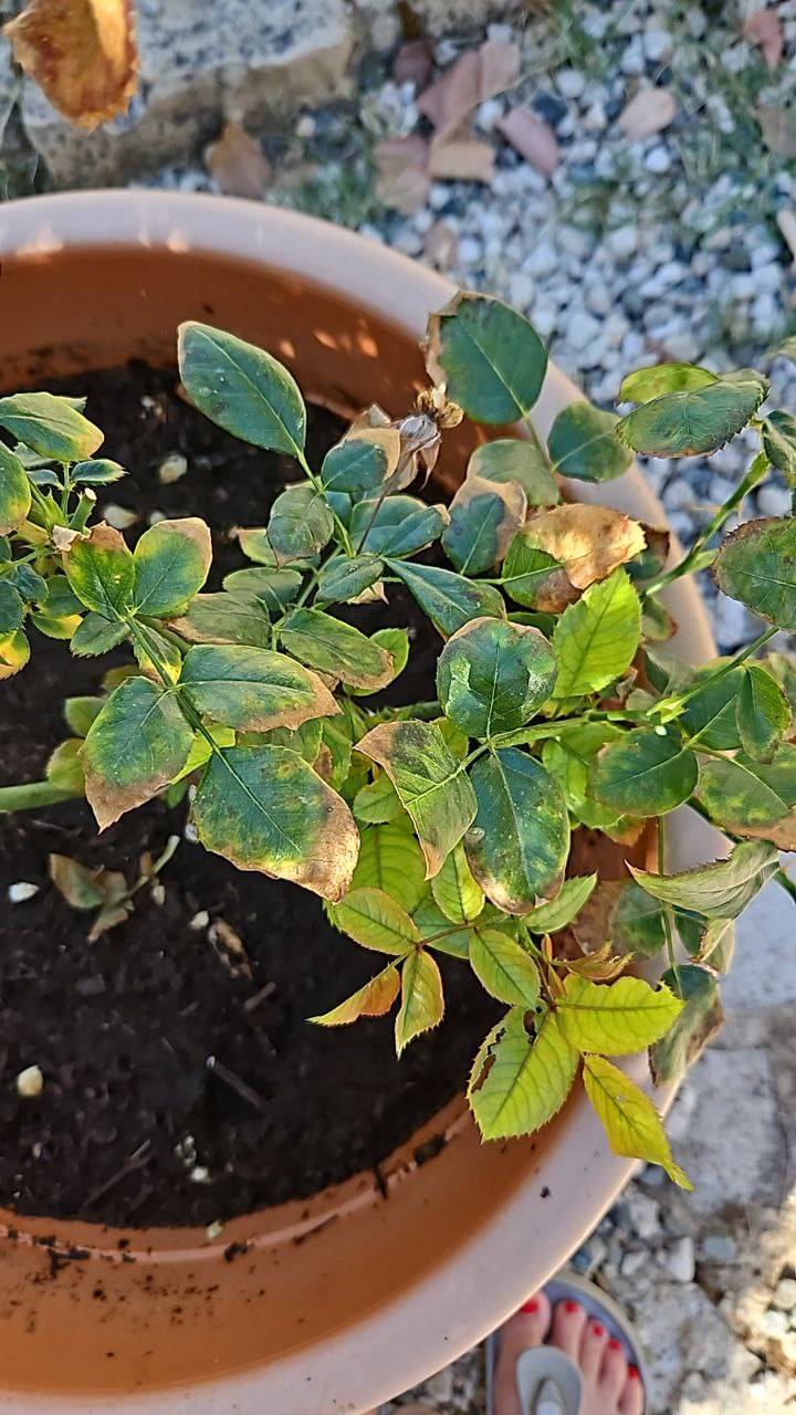 На новых листьях - хлороз. На старых фиолетовые пятна - дефицит фосфора. Почему новые хлоротичные, причин может быть много, так сразу сложно сказать. Но выглядит так, будто вы её не удобряете. Розу нужно удобрять по сути, после каждой партии выпущенных цветов - щедро и комплексным удобрением, и во время самого цветения разок фосфорно-калийное удобрение не помешает. Прям какого-то гриба я у вас на растении не вижу, но превентивно, учитывая вспышку везде мучнистой росы, можно обработать Топазом.