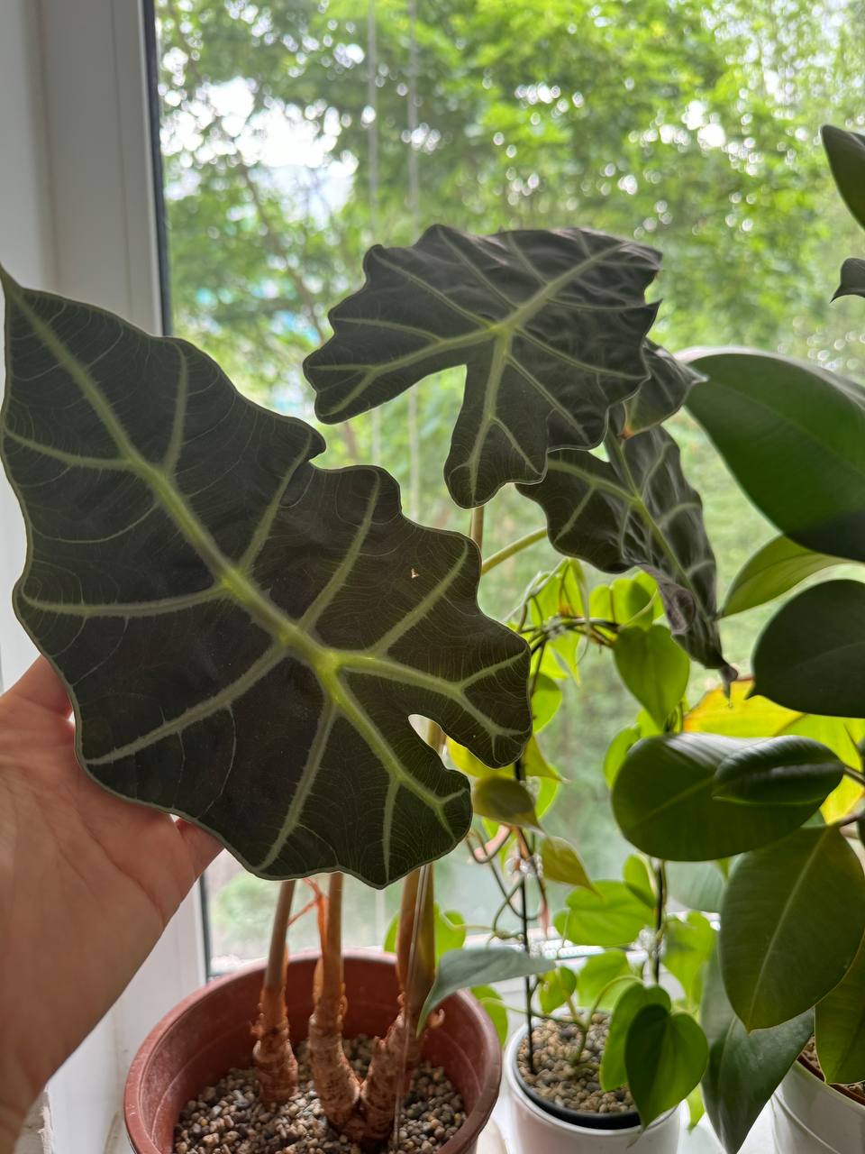 Радует что алоказия после пересадки жива. Стоит уже вне теплицы