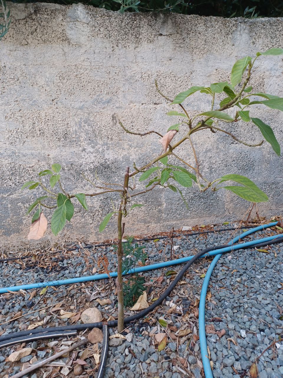 Не могу с уверенностью сказать, но похоже, что ему не хватает воды. Попробуйте увеличить объём полива на треть (например). Далее, для профилактики купите порошковое железо, разведите его так, как на упаковке будет указано в профилактических целях, и внесите в почву вокруг ствола. В дополнение к этому купите гранулированое удобрение с содержанием азота (nitrate) больше 20% (это первая цифра из трёх на упаковке - например "35-10-15", "40-0-0") и разбросайте около 50 граммов вокруг ствола в радиусе 5-10 сантиметров. Камни предварительно имеет смысл убрать. Посмотрите, какие изменения будут через месяц. Надеюсь, что появятся новые веточки с листиками.